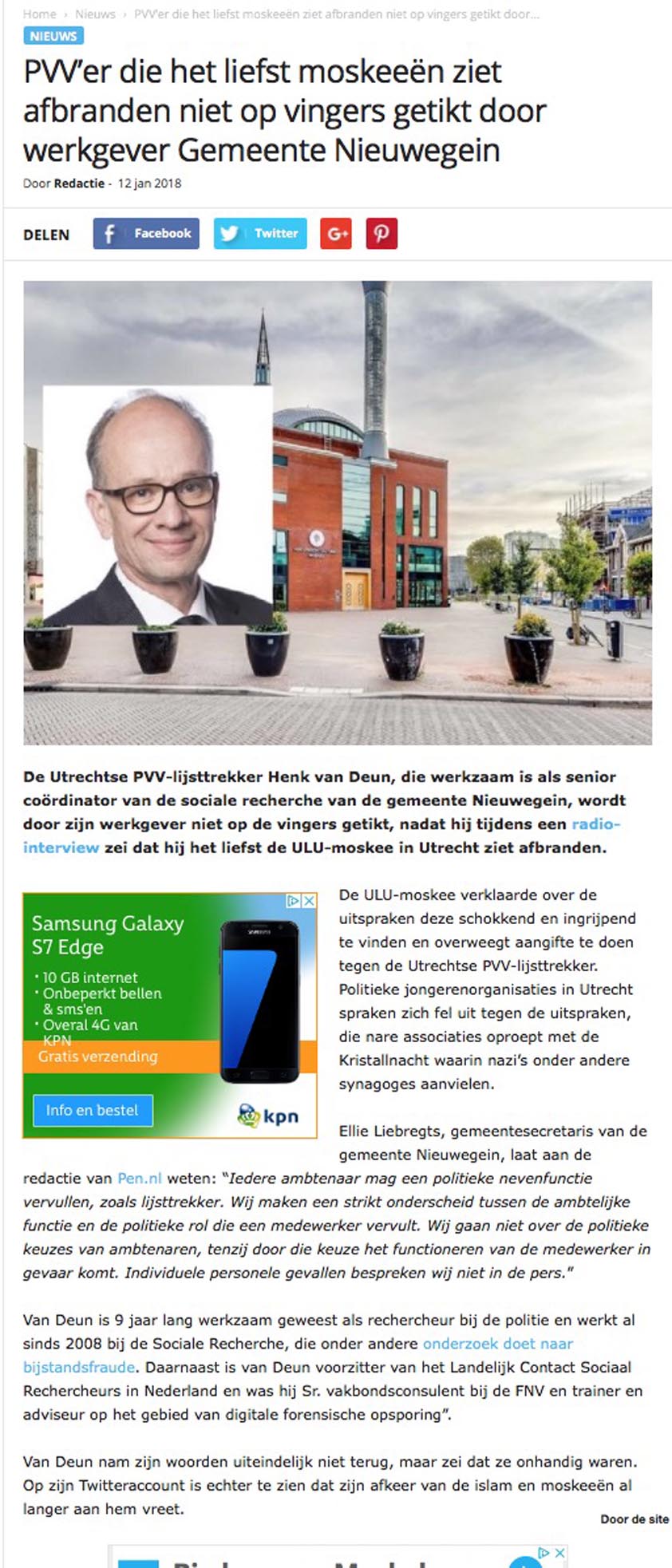 Maar nu komt het. Deze ambtenaar meent dat de ULU Moskee in de Utrechtse wijk Lombok maar moet afbranden en hij verklaarde dat ook publiekelijk. Ik weet niet hoe u hierover denkt maar ik vind dit persoonlijk niet kunnen. Natuurlijk kennen wij de vrijheid van meningsuiting (maak er tenslotte zelf ook ruimschoots gebruik van in mijn columns en elders, maar ik schrijf ook niet altijd op wat ik daadwerkelijk denk en ik stel mij wel altijd de vraag: moet ik dit opschrijven en welk doel dient dit als ik het doe? Deze meneer vindt dat hij dit allemaal kan uitkramen terwijl hij door ons als Nieuwegeiners word betaald. En misschien is er nog iets veel schadelijker dat aan de oppervlakte kwam na deze uitspraak, want zijn directe baas mevrouw Liebregts, de gemeentesecretaris, gaf te kennen hier totaal niet van wakker te liggen.