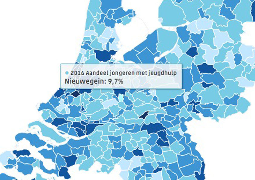 De meeste jeugdhulp werd verstrekt in Hoogezand-Sappemeer, Zoetermeer, Hillegom en Roermond. Daar kreeg meer dan 15 procent van de jongeren hulp. Ook andere gemeenten in Groningen en Limburg hebben relatief veel jeugdhulpklantjes. In gemeenten als Schiermonnikoog en Staphorst wordt jeugdhulp het minst verschaft, namelijk aan minder dan 6 procent.