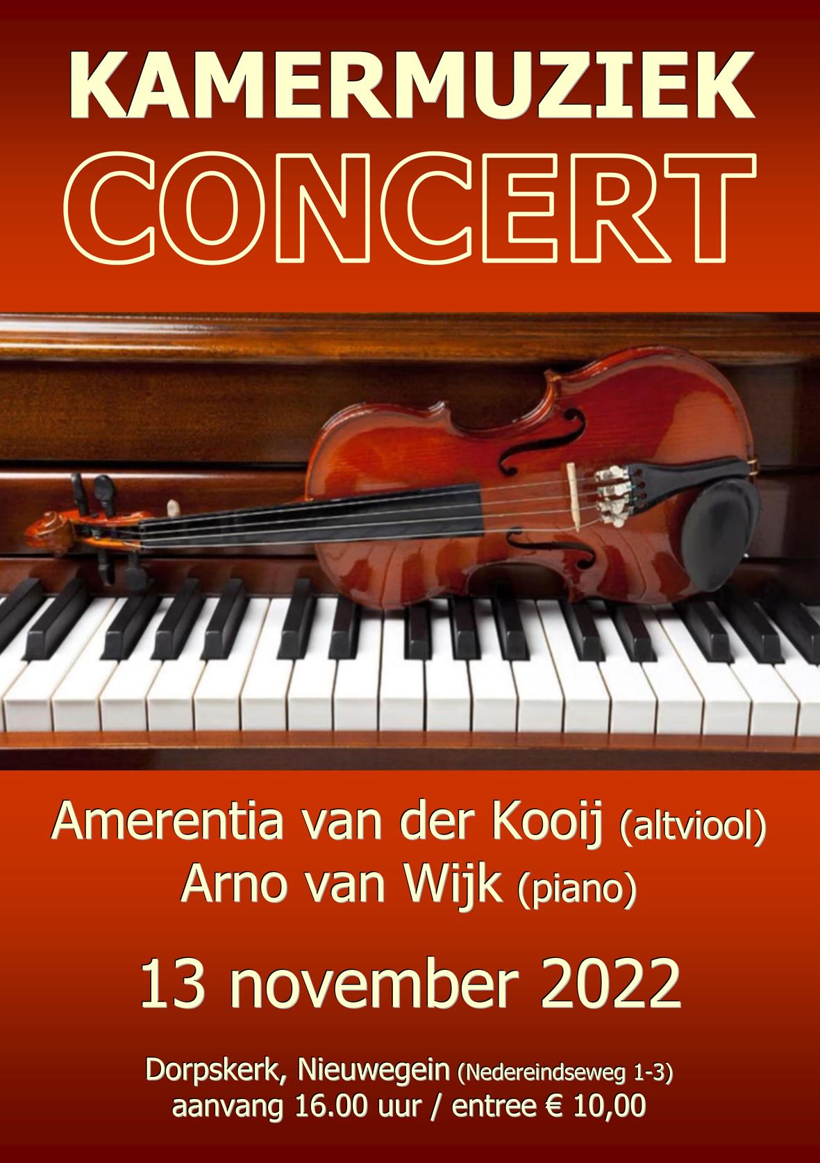 De Dorpskerk is vanwege haar intieme karakter en goede akoestiek zeer geschikt voor muziek in kleinere bezettingen, zoals kamermuziek. Het concert wordt gegeven door Amerentia van der Kooij op altviool en Arno van Wijk op piano. Beide musici hebben elkaar leren kennen op de middelbare school en sinds die tijd vormen ze een vast duo, zowel met viool en altviool en met orgel en piano.