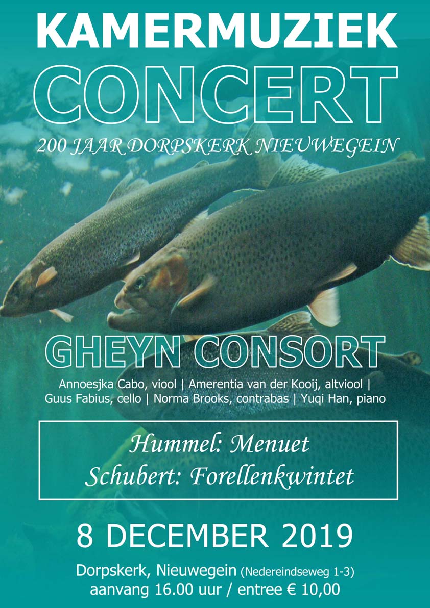 Het kamermuziekconcert van zondag 8 december sluit hierbij aan met het Quintett A-Dur van Franz Schubert, beter bekend als het Forellenkwintet. Dit stuk schreef Schubert ook precies 200 jaar geleden, in 1819. Tijdens een zomervakantie met een goede muzikale vriend kreeg Schubert de vraag om een stuk te schrijven passend bij de bezetting van het kwintet van Hummel (voor viool, altviool, cello, contrabas en piano, een ongebruikelijk samenstelling voor een kwintet). Dat werd dus het zgn. Forellenkwintet. Schubert maakte gebruik van een lied dat hij al eerder had geschreven, Die Forelle, om het stuk vorm te geven. Het is een stuk geworden waarin de natuur in al haar pracht en praal te horen is. Het hoofdthema gaat over een forel die vrolijk spetterend door het water zwemt.