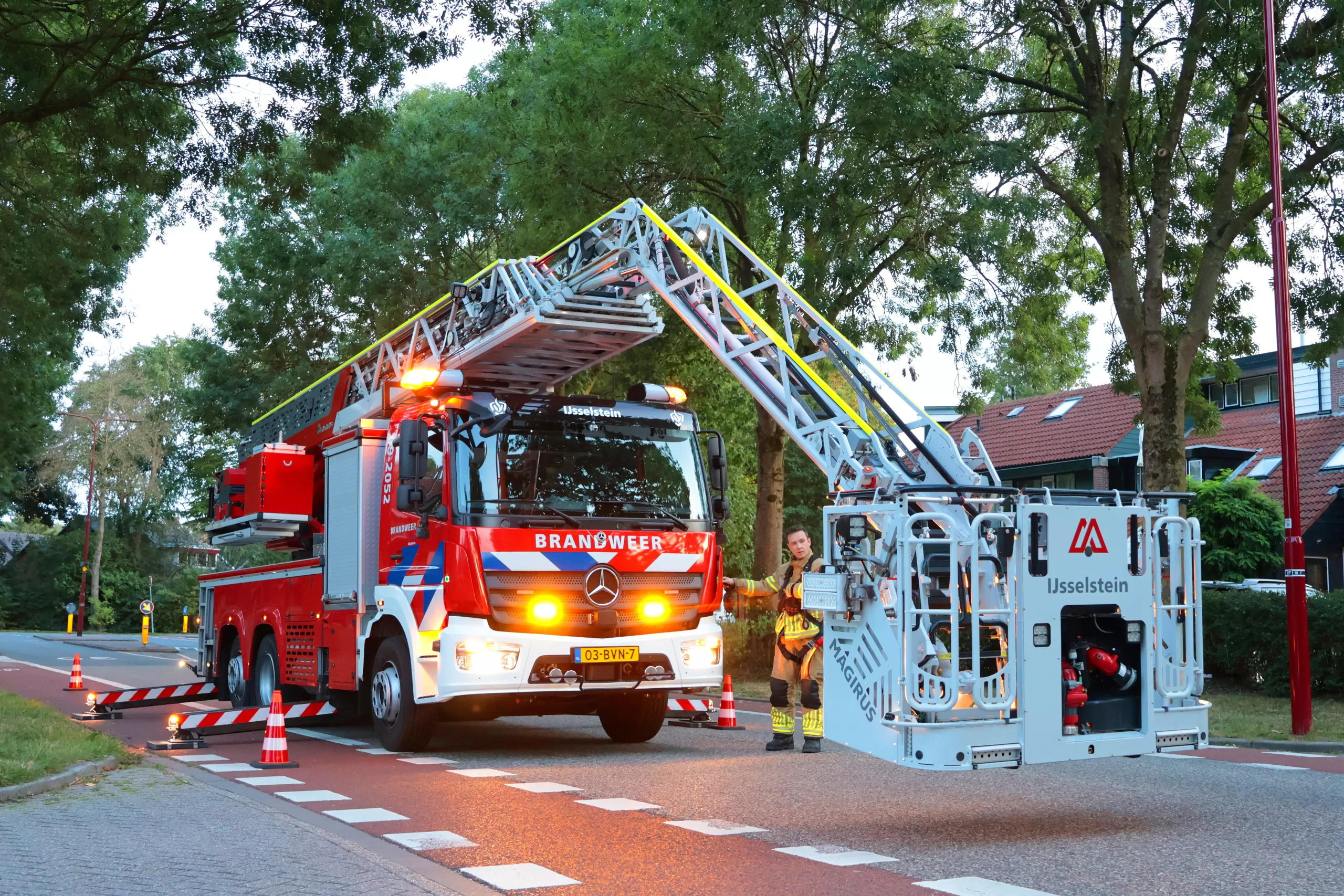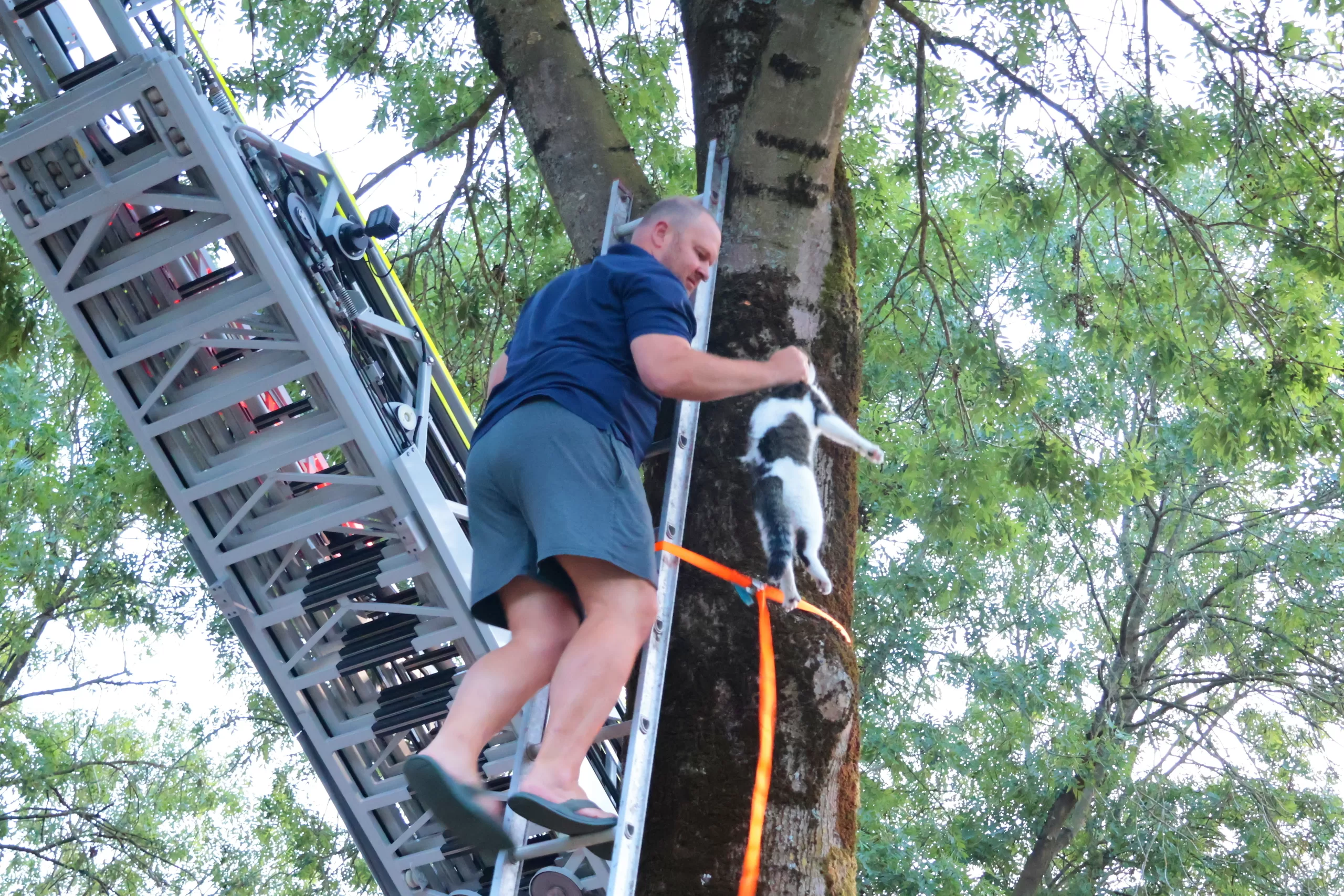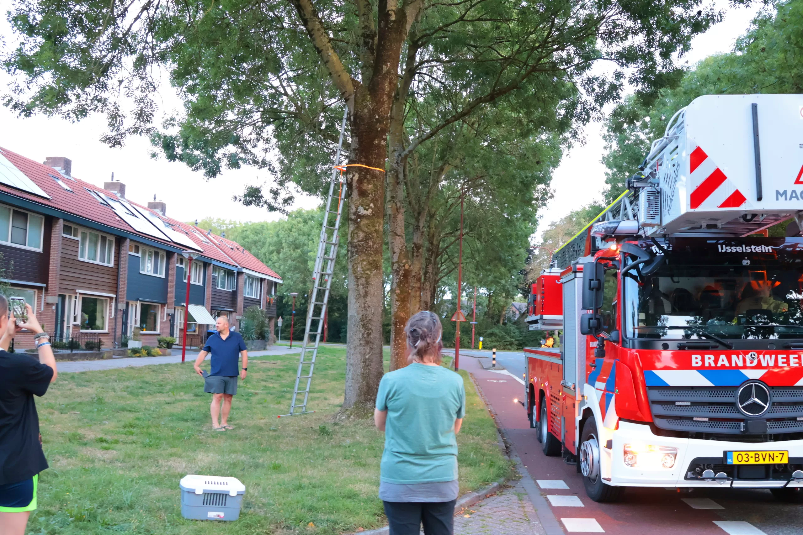 Met de ladderwagen uit IJsselstein kwamen de hulpverleners ter plaatse. Vanuit de korf werd geprobeerd de kat te bereiken. Dat werkte: Tigger klom iets naar beneden, waardoor de eigenaar hem alsnog zelf kon pakken. Na een spannend avontuur belandde Tigger veilig in de reismand en ging hij mee terug naar huis.