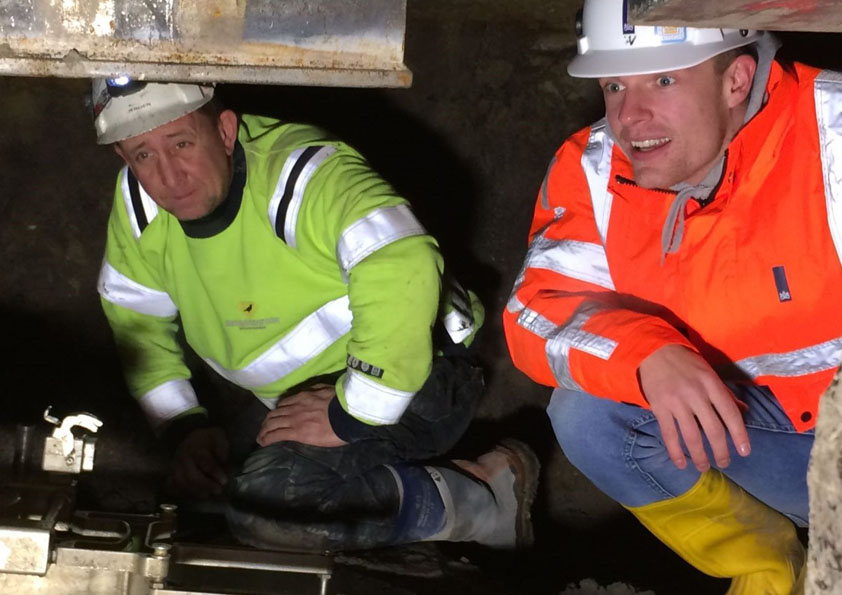 Vlogger Enzo Knol (rechts) aan ket kijken tijdens het werk bij de Beatrixsluis