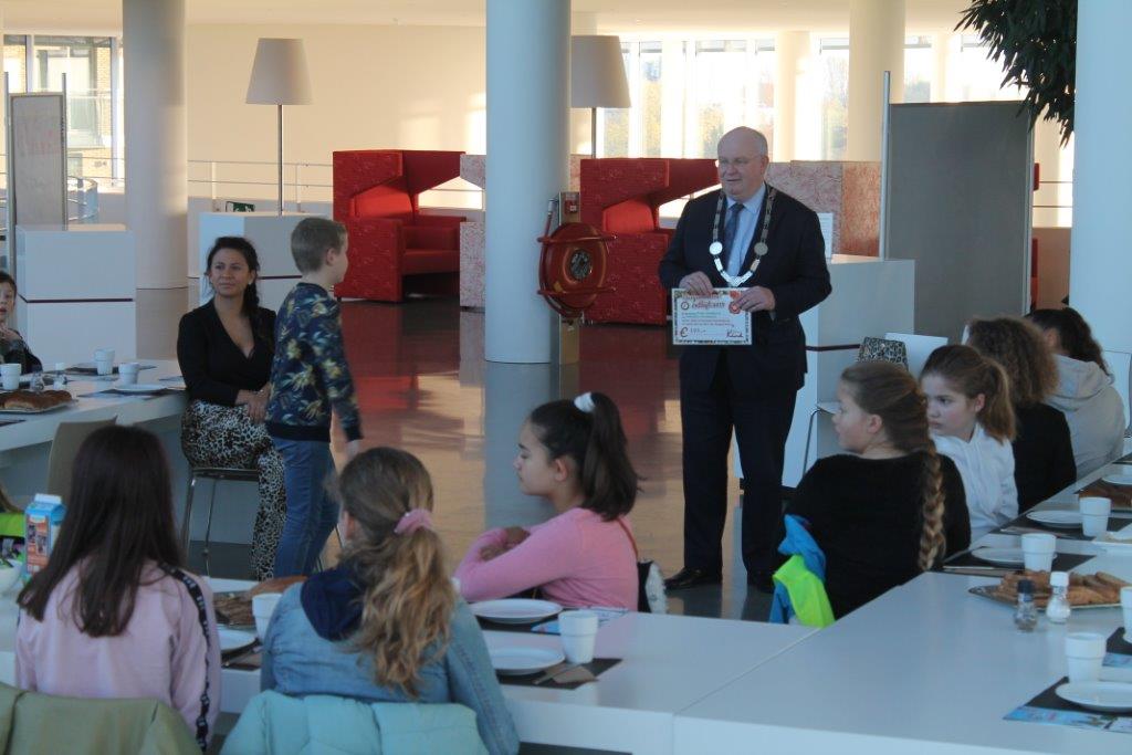 Burgemeester Frans Backhuijs van Nieuwegein heeft vrijdagmorgen 8 november jl. ontbeten met 23 leerlingen van de basisschool De Krullevaar uit Nieuwegein. Dat gebeurde in het bedrijfsrestaurant van het Stadshuis. Het werd een gezellig samenzijn met verschillende gezonde lekkernijen, tot grote vreugde van de kinderen van de school in de wijk Zuilenstein.