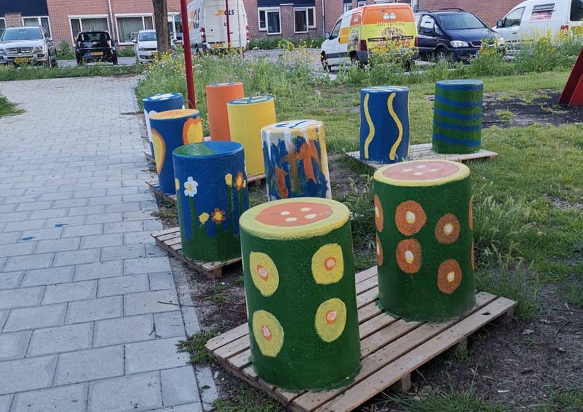 Bewoners van de Rijtuigenbuurt hebben dinsdagmiddag 18 juni jl. hun creatieve talenten laten zien. Zij schilderden met elkaar enkele poefjes in allerlei vrolijke kleuren. De fraaie poefjes worden straks geplaatst aan het Karrespoor ter hoogte van de Karosbrug en de Karosdrift. Eerder werden er al kleurrijke kunstwerken in de bomen gehangen.