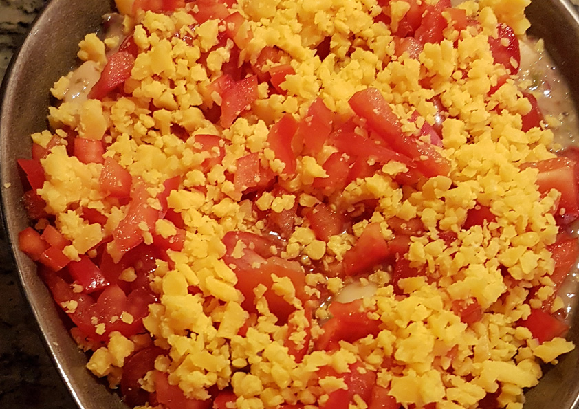 Zout naar smaak toevoegen. Af laten koelen en garneren met de cheddar, paprika en tomaat.