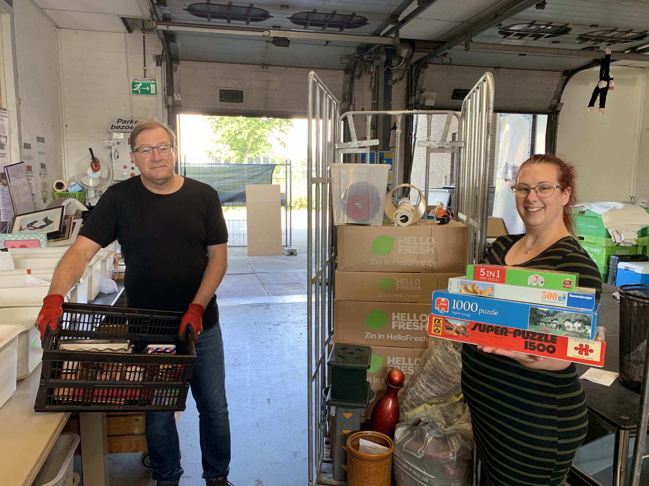 Op de foto: Medewerkers Giel en Sanne werken wekelijks in het magazijn