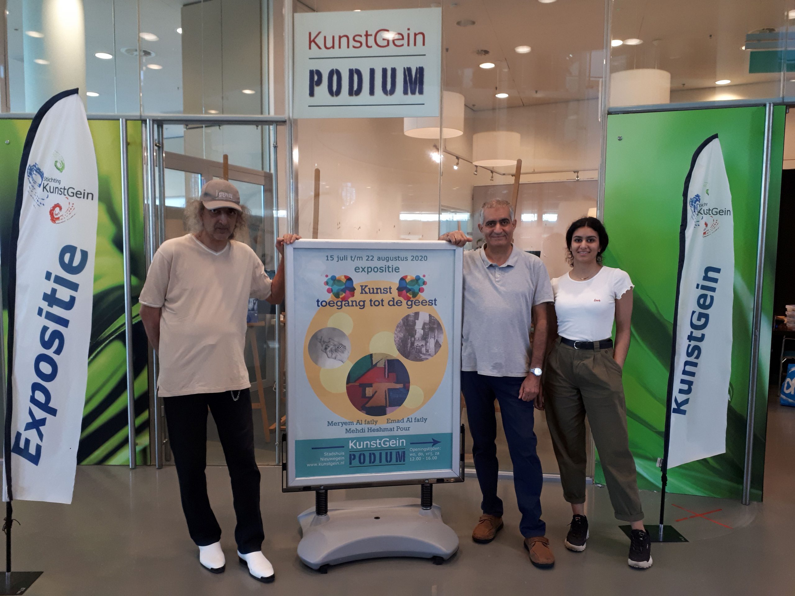 Met de nieuwe expositie ‘Kunst, toegang tot de geest’ in het KunstGein Podium hangen deze keer werken van drie kunstenaars bij elkaar. Samen geven de getoonde werken een andere blik op kunst, een mooie combinatie van totaal verschillende stijlen. Op de foto de verantwoordelijke kunstenaars: Mehdi Heshmat Pour en Emad Al fatly en dochter Meryem. De expositie is te zien vanaf 15 juli t/m 22 augustus.
