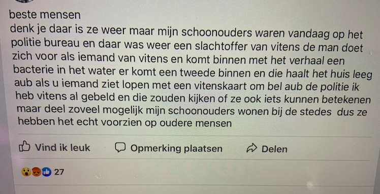 Volgens het slachtoffer doen diverse personen zich voor als medewerkers van Vitens. Zo proberen zij oudere mensen geld afhandig te maken. ‘De oplichters komen binnen met het verhaal dat er een bacterie in het water zou zitten. Daarna komt er een tweede man binnen en die haalt het huis leeg’ aldus een familielid van het slachtoffer in een reactie. Ook doen zij zich voor als meteropnemer, monteur, inspecteur of watermonsternemer om binnen te komen.
