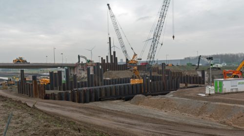 ‘Fascinerend als je je realiseert dat eind 2018 het water stroomt op plekken waar je nu loopt in een enorme (270×25 meter) sluiskolk. Omgevingsmanager Jacco Kwakman nam de deelnemers eerst mee naar de plaats waar de sluis(schuif)deuren aan de Lekzijde komen. Daar werd ons duidelijk waarom de grond eerst wordt opgehoogd(!) om vervolgens uiteindelijk plaats te maken voor beton en water… Daarna bracht hij de groep onder de tijdelijke fietsbrug door naar uitvoerder Jeroen Boom die een duidelijke uitleg gaf; wat is er nodig om stalen damwanden meer dan 25 meter de kaarsrecht de bodem in te ’trillen’. De groep kon dat ook van dichtbij horen en voelen!’