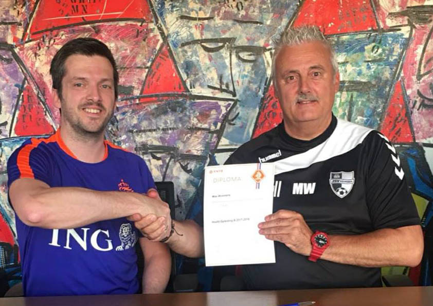 Op de foto: Jan Kroes van de KNVB heeft het diploma Hoofd Opleidingen-B uitgereikt aan Max Wimmers met de trots dat hij onderdeel hebt mogen zijn aan het mede vormgeven van deze nieuwe KNVB opleiding.