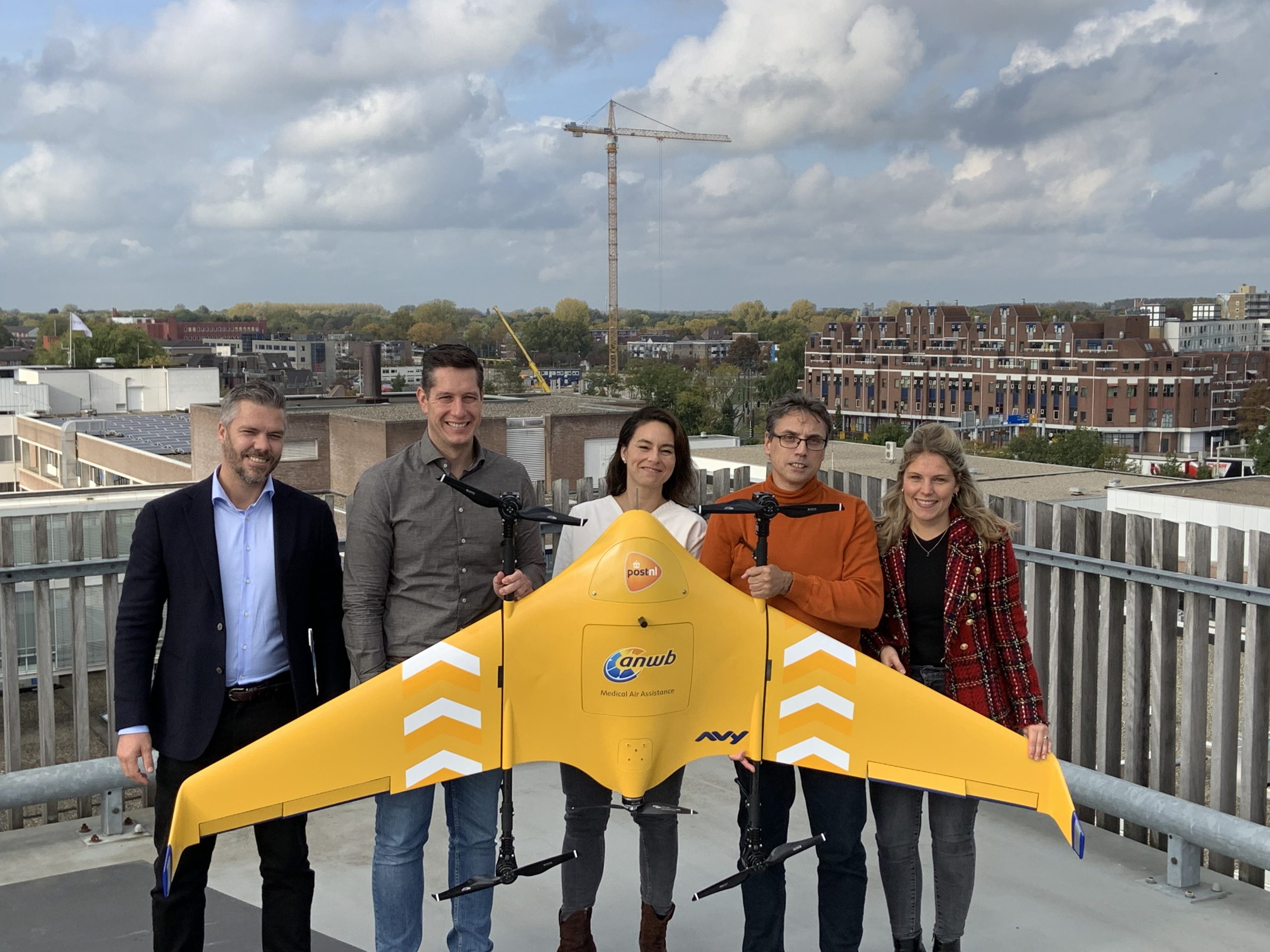 Op de foto vlnr: Manager business development Medical Drone Service Boy van der Velden, Angela Bikker (klinisch chemicus), projectleider Bart Deege, manager klinische chemie Aldrick Peterson en business developer Rose van Rooijen van Medical Drone Service met het prototype van de drone op het dak van het St. Antonius Ziekenhuis in Nieuwegein.