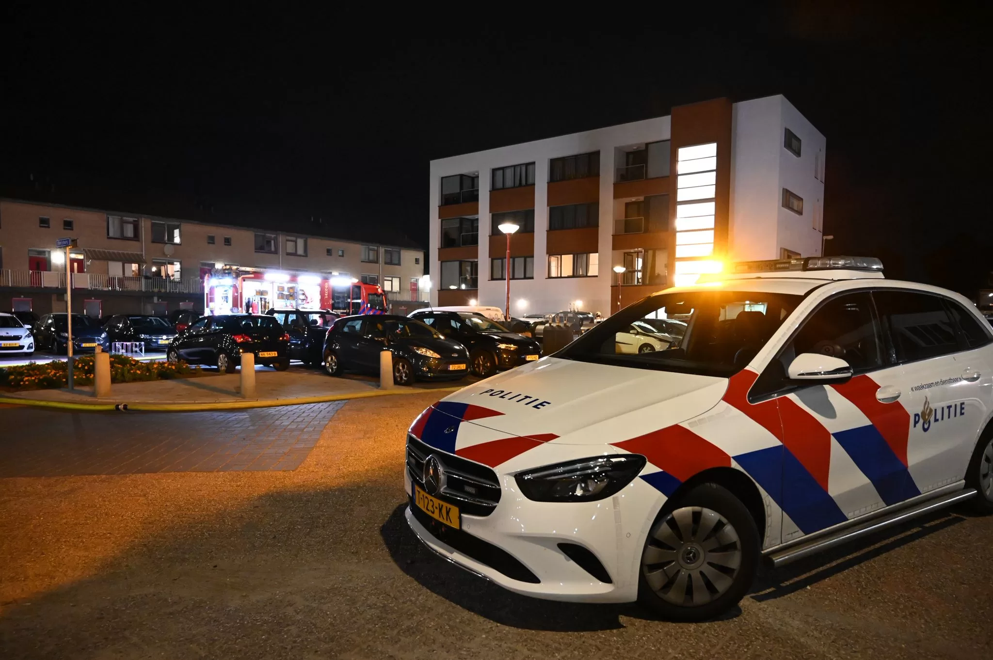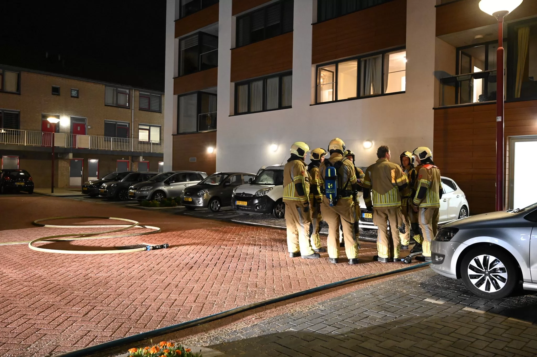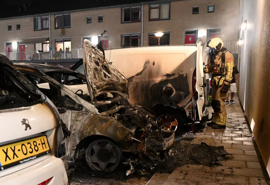 De brandweer rukte met meerdere wagens uit en trof ter plaatse drie voertuigen aan die in brand stonden of al grotendeels door het vuur waren verwoest. Het ging om een personenauto, een bestelbus en een tweede auto die geparkeerd stonden langs de woningen. Door de hitte sprong het glas van de auto’s en sloegen de vlammen uit de voertuigen.