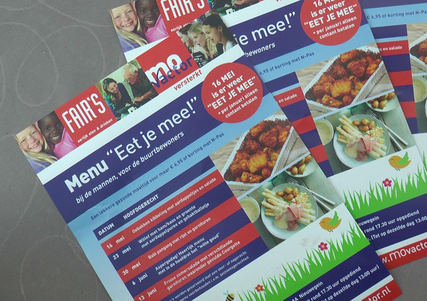 Wekelijks wordt met veel plezier een maaltijd met verse en gezonde ingrediënten gekookt onder begeleiding van professionele kok Mischa. De mannen plannen de menu’s zes weken vooruit. Hiervan wordt een flyer gemaakt die verkrijgbaar is bij Movactor en het Buurtplein. De inkoop wordt in overleg met de plaatselijke buurtleveranciers afgestemd om een verse en gevarieerde maaltijd te bieden die past bij het seizoen.