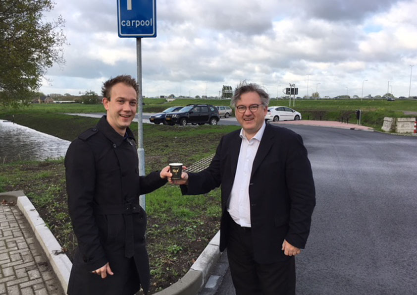 Koffie voor de carpoolers. Recht wethouder Johan Gadella
