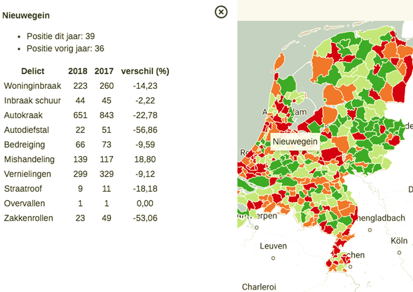In Nieuwegein steeg wel het aantal mishandelingen. Waren dater in 2017 nog maar 117, werden in 2018 maar liefst 139 mishandelingen gemeld. Dat is een stijging van 18,8%! Het aantal overvallen bleef gelijk: 1. De rest van de cijfers ziet u hieronder.