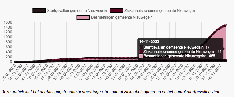 Hieronder een grafiek met de ontwikkeling van het aantal besmettingen, ziekenhuisopnames en sterfgevallen in Nieuwegein. Op 1 april dit jaar stierf de eerste inwoner uit Nieuwegein door het Coronavirus.