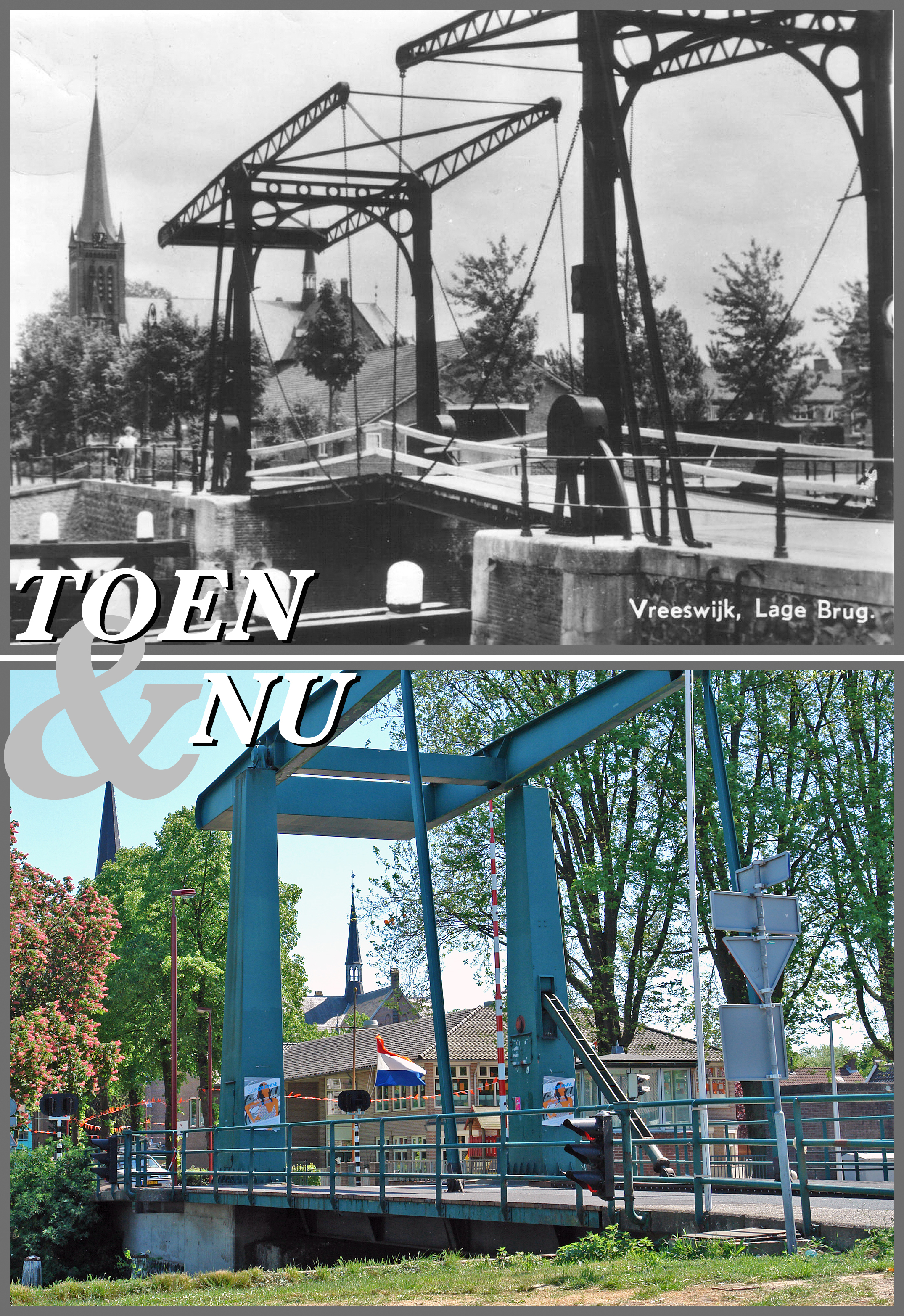 Bij de foto van Toen schrijft de Historische kring Nieuwegein me het volgende: ‘Een foto van de Lagebrug in Vreeswijk, zoals de Wilhelminabrug ook wel wordt genoemd. De brug is gebouwd aan het einde van de negentiende eeuw. In 1892 werd de Koninginnensluis officieel in gebruik gesteld door de beide Koninginnen, Regentes Emma en de 12 jarige Wilhelmina. In de Nieuwegeinse tijd is de karakteristieke burg vervangen door een brug met een moderner aanzicht. Op de achtergrond de Barbarakerk en de Prins Willem Alexanderschool.’