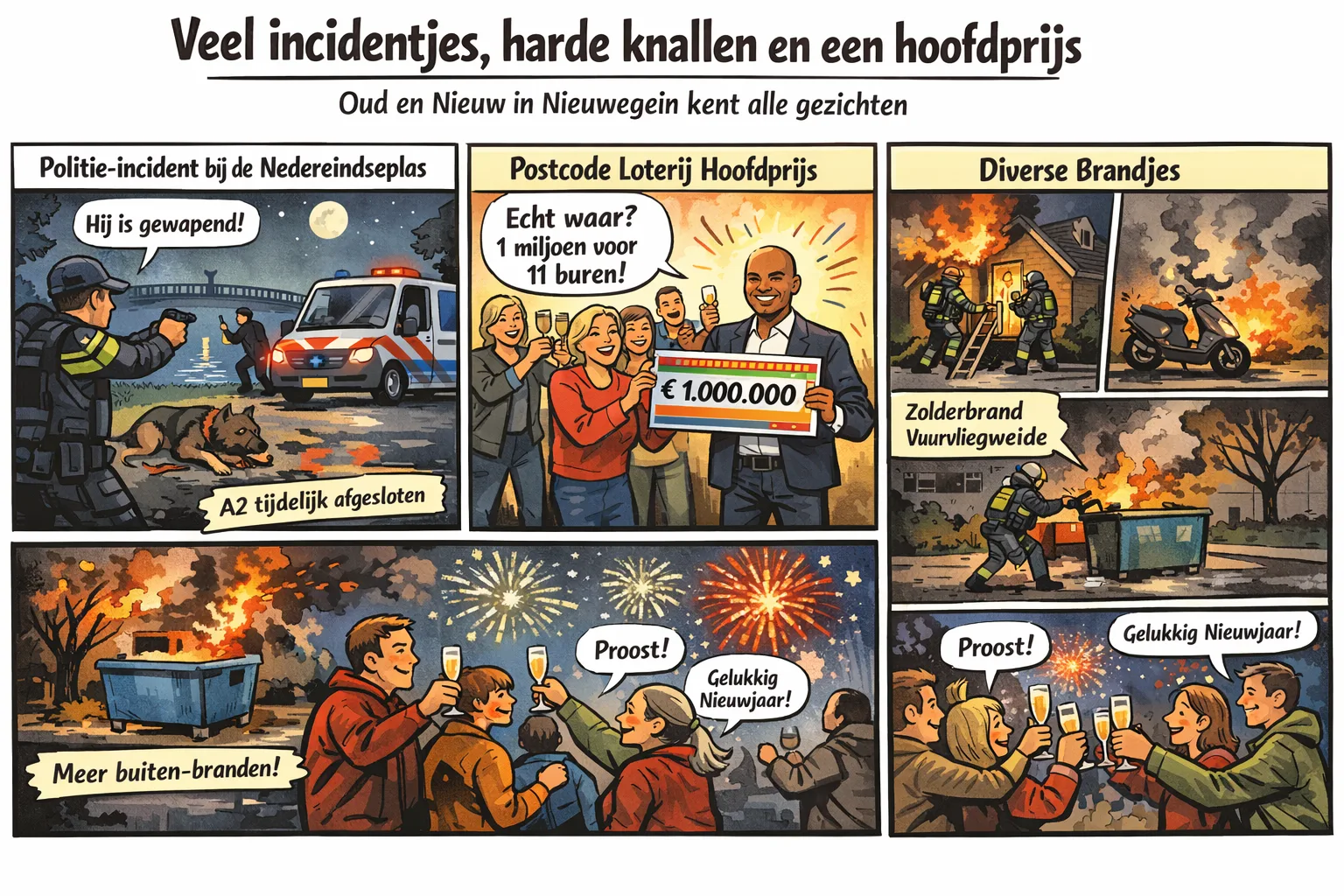 Oud en nieuw in Nieuwegein had meerdere gezichten. Er was feest en vuurwerk, maar ook een reeks kleine branden en een ernstig politie incident bij de Nedereindseplas. En alsof de stad het contrast zelf uittekende, viel er vlak voor de jaarwisseling een postcodeloterij hoofdprijs.