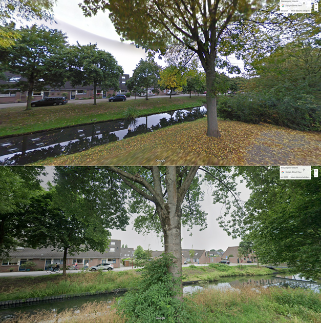 ‘Persoonlijk vind ik de wildere oeverbegroeiing in 2022 aantrekkelijker dan de wel heel kort geschoren oevers in 2009 en vooral voor dieren is deze wildere begroeiing veel geschikter. Ik ben benieuwd of het beleid is van de gemeente of dat dit ontsnapt is aan de gemeentelijke controle. Wat vindt u aantrekkelijker om naar te kijken, wat doet het met uw groenbeleving?’