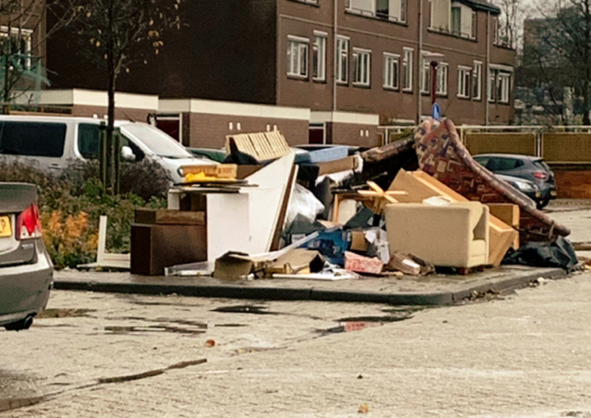 Lezeres Sita Balgit stuurt de redactie een foto van een enorme puinhoop op een parkeerplaats aan de Kloosterdrift. Hoewel zij de gemeente heeft geïnformeerd en gevraagd heeft actie te ondernemen, ligt deze troep daar inmiddels meerdere dagen.