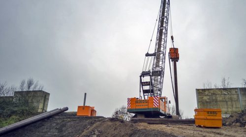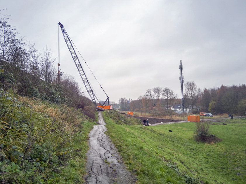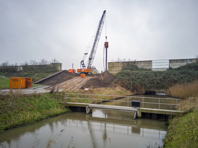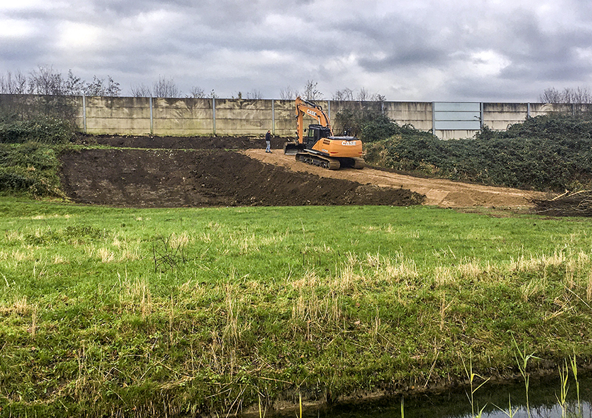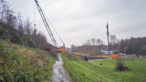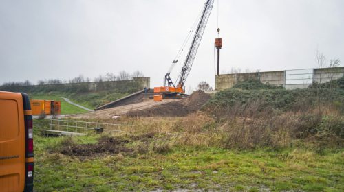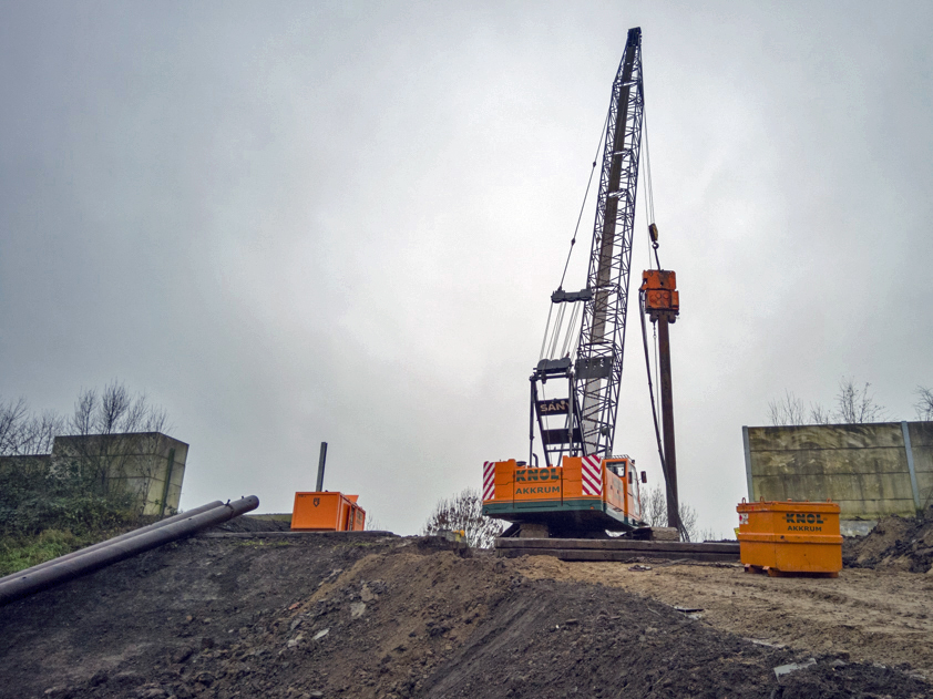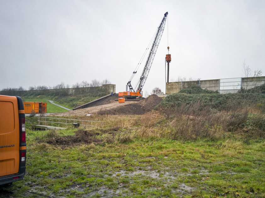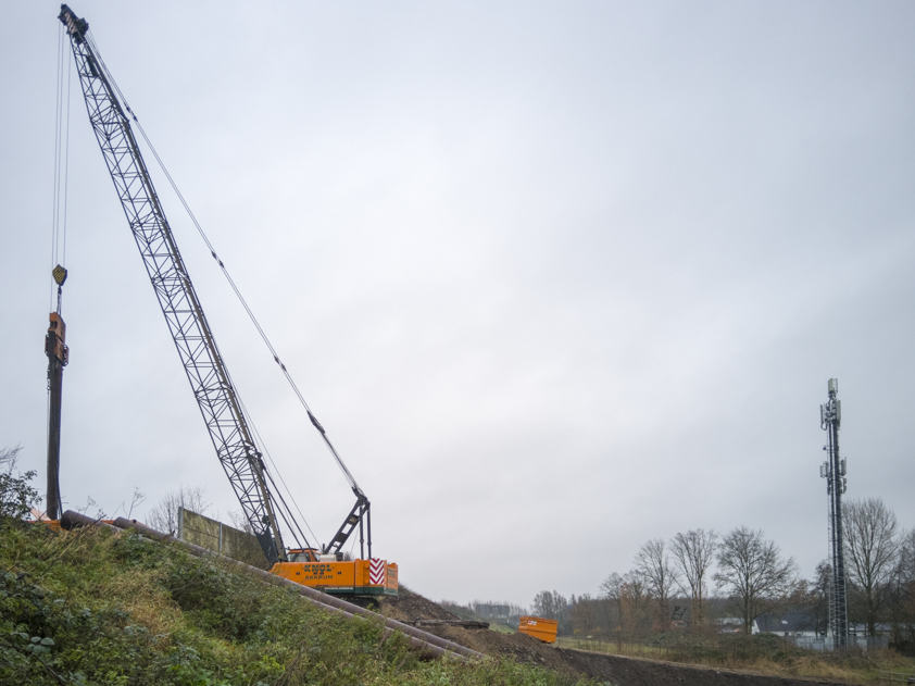 ‘De helling die recent is aangelegd is een tijdelijke voorziening, zodat bijvoorbeeld de heimachine op de bouwlocatie kan komen: bovenop de geluidswal. De bestaande helling is daarvoor namelijk te steil.’