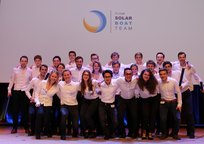 Max Bouwmeesters, tweede van links op de voorste rij, met het team van de Solar Boat tijdens de presentatie