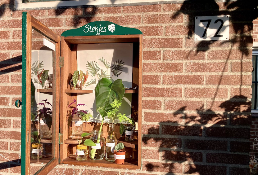 Tineke: ‘Er staan verschillende soorten plantenstekjes voor voorbijgangers om mee te nemen, of om te ruilen tegen een eigen stekje of plantje. De namen van de plantensoorten staan erbij en de potjes mogen ook worden meegenomen. De ‘stekjesbieb’ mag ook worden aangevuld met eigen stekjes of kleine plantjes. Zo blijft het steeds verrassend! Ruilen mag dus, maar als je niets te ruilen hebt en je wordt in het voorbijgaan plotseling verliefd op het mooie fluweelplantje dat er nu staat, of het grote blad van de monstera: neem gerust mee en ga er van genieten!’