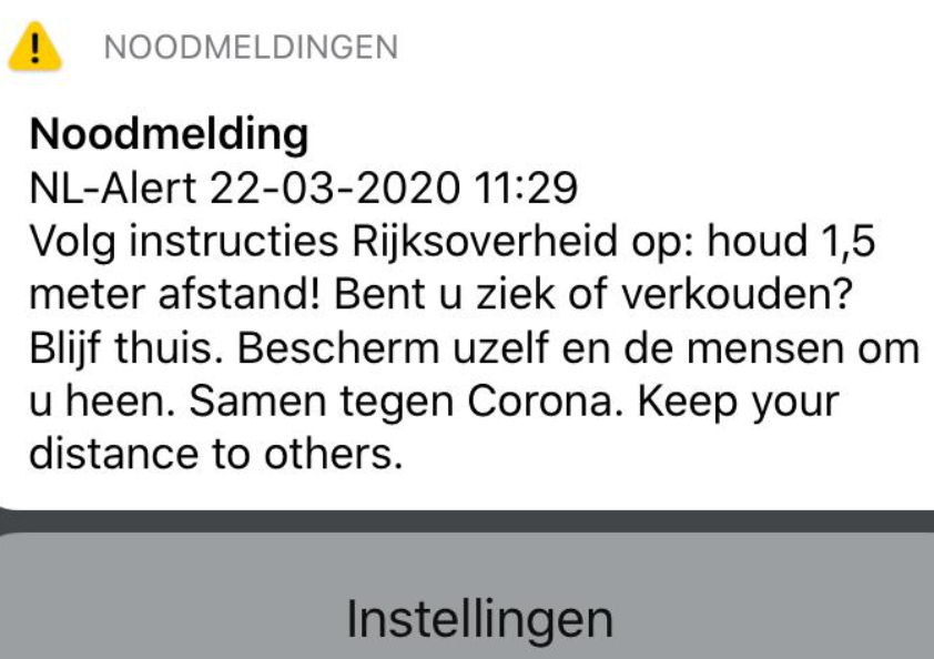 Vanmorgen heeft de Rijksoverheid een noodmelding verzonden. Middels een NL Alert vraagt de Rijksoverheid de instructies op te volgen en 1,5 meter afstand te houden. Bent u ziek of verkouden? Blijf thuis. Bescherm uzelf en de mensen om u heen. Samen tegen Corona. Keep your distance to others.