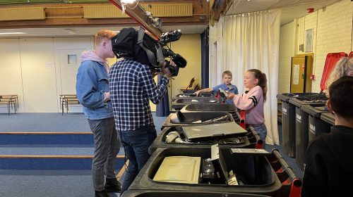Directeur Madelon Torenstra en drijvende kracht achter groep 6 meester Roland Jacobs keken trots toe hoe de kinderen aan de cameraploeg van het Jeugdjournaal lieten zien wat ze de afgelopen tijd geleerd hadden over het belang van recycling.