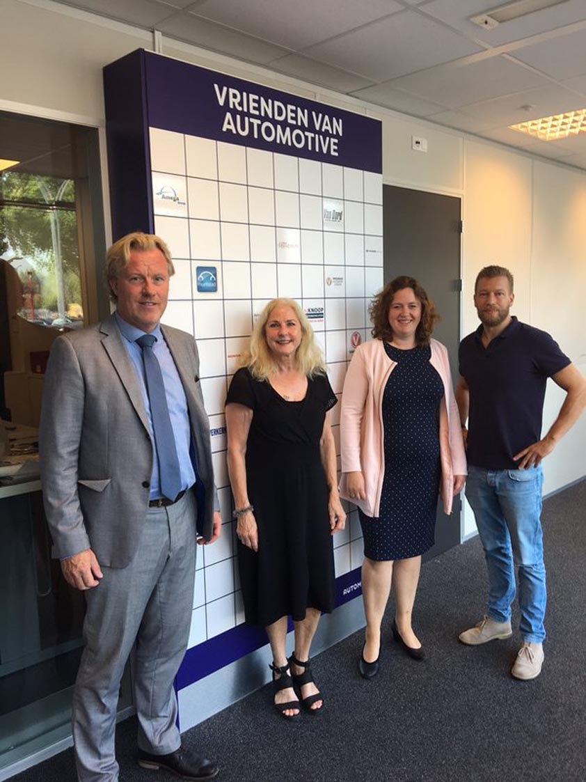 Foto van het eerste bestuur met v.l.n.r.: Ruud van Diemen, directeur Automotive College, Anja Severs, directeur organisatiebureau Pronto, Arrianne van Es, personeelsfunctionaris Schakel Autogroep en Imre ten Pas van E&R Opleidingen.