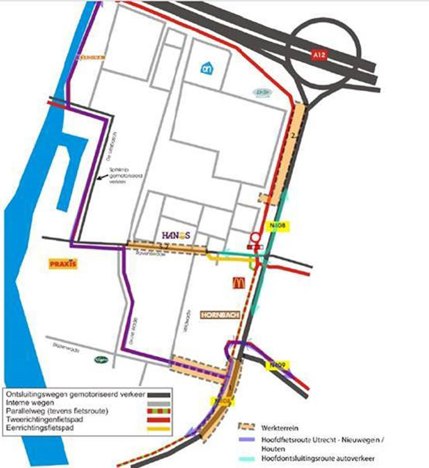 Op onderstaande afbeelding is de nieuwe fietsverbinding met de paarse pijl weergegeven. Om de nieuwe fietsverbinding aan te duiden, plaatst de aannemer gele borden. Door te starten met de aanleg van de nieuwe fietsverbinding kan ook het fietsverkeer gedurende de werkzaamheden door blijven stromen.