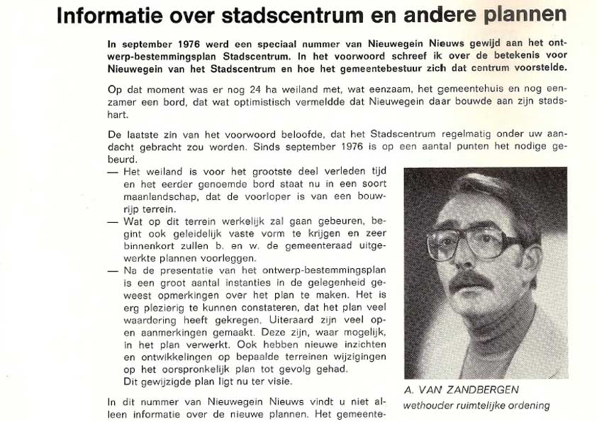 In de loop van donderdagavond 9 maart jl. is oud wethouder Ton van Zandbergen (geb. 16-11-1934) overleden. Ton is 82 jaar geworden. Van Zandbergen stond aan de wieg van de realisatie van het stadscentrum Nieuwegein en is mede bepalend voor de stad Nieuwegein geweest.