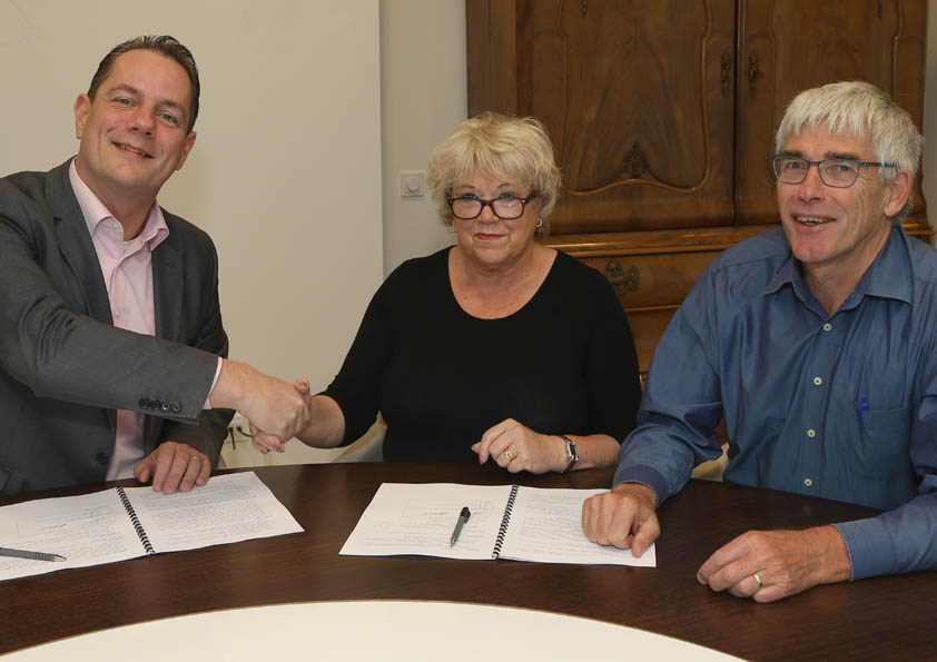 Wethouder Hans Adriani en mevrouw Van Heel-van Rooij en de heer Wever, bestuursleden VvE Van Reeslaan, ondertekenen de sociale overeenkomst Verzorgd Wonen.
