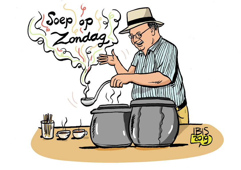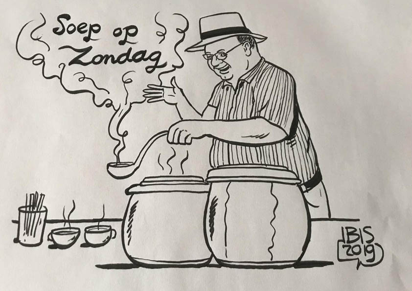 Ruim 35 wijkbewoners uit de wijk Fokkesteeg kwamen afgelopen weekend naar de Bedumerschans. Niet alleen om te genieten van het mooie weer, maar ook om de eerste kom groente- of linzensoep te krijgen uit handen van de burgemeester. Dat gaf onze karikaturist Jan Ibelings inspiratie voor bovenstaande karikatuur want dat smaakte naar meer.