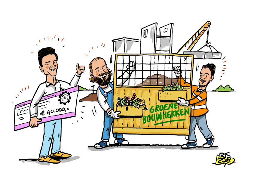 Een deskundige jury heeft onlangs een bedrag van 40.000 euro toegekend aan het project Groene Bouwhekken. Ondernemer Hugo Ward over zijn project: ‘Het komt er op neer dat we in plaats van de gebruikelijke, saaie, grijze hekken rond bouwlocaties mooie houten afscheidingen plaatsen met plantenbakken met steeds bloeiende planten er in. Dat ziet er een stuk vrolijker uit. Bij het plaatsen van de hekken, het transport en het beheer van de planten zetten we mensen met een afstand tot de arbeidsmarkt in. De meeste van hen stromen door naar betaald werk.’ Onze karikaturist Jan Ibelings maakte zijn groene hekje voor onze lezers. Vrolijk hè.