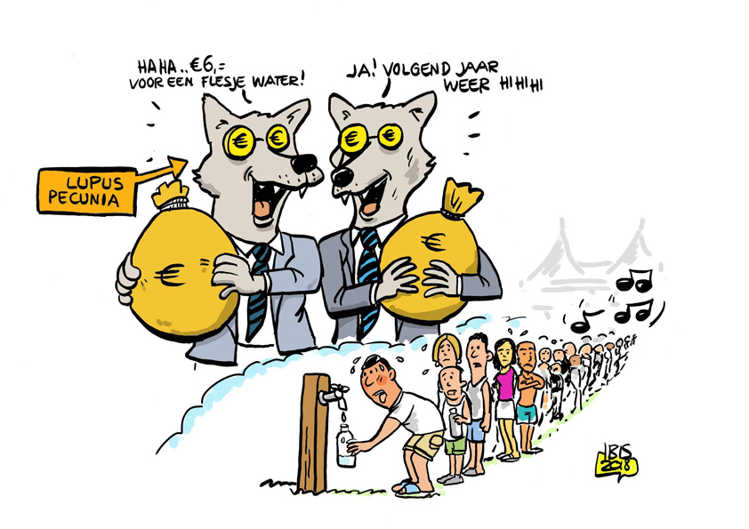 Bezoekers van popfestival Central Park bij DownUnder in Nieuwegein waren zaterdag 26 mei jl. wederom ontstemd over het gebrek aan gratis drinkwater op het festivalterrein. Zo’n 28 graden was het afgelopen zaterdag in Nieuwegein, waar onder meer Kensington, Blaudzun en Wulf optraden. De organisatie zorgde volgens bezoekers voor onvoldoende gratis drinkwater. Ook over de prijs van een flesje water aan de bar waren de feestgangers niet te spreken: zes euro voor een klein flesje! Onze karikaturist rekende zich al rijk en maakte bovenstaande tekening.