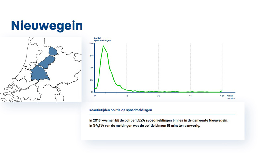 In 2017 deelt de politie nog de halfjaarcijfers op haar website. Daar vindt de burger ook een infographic die de inspanningen van de politie op het gebied van spoedmeldingen in beeld brengt. In 2018 wil de politie de cijfers frequenter publiceren. Op deze manier kunnen burgers duidelijk zien hoe de politie presteert op reactietijden. De cijfers vindt u op de website van de politie.