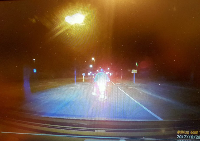 De scooterrijder maakt de wheelie. Niet zo slim, de politie rijdt achter hem en legt het vast op de dashcam.