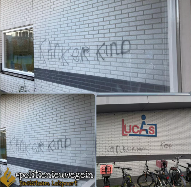 Op de muren van basisschool Lucas Galecop in Nieuwegein hebben vandalen met graffiti de woorden ‘kankerkind’ en ‘kankerschool’ gespoten. De politie laat weten op zoek te zijn naar de daders.