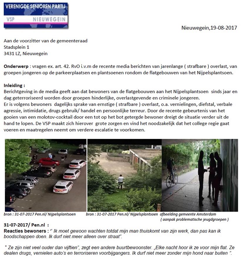 Na eerdere berichtgevingen op De Digitale Stad Nieuwegein van overlast van groepen jongeren op de parkeerplaatsen en plantsoenen rondom de flatgebouwen van het Nijpelsplantsoen, eist de politiek nu opheldering over deze problematiek van burgemeester Frans Backhuijs. In een brief ex art. 42 wil de Verenigde Senioren Partij (VSP) duidelijkheid.