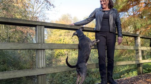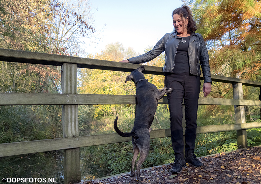 ‘Ik weet inmiddels dat Natasja en haar gezin een hond uit Gran Canaria hebben geadopteerd, dus wanneer er een mevrouw met een hond aan komt wandelen die mevrouw kijkt me onderzoekend aan, weet ik: dit is Natasja. We wandelen gedrieën, Natasja, Nelson en ik al babbelend over de parkeerplaats de Parkhout in en bij een bruggetje gaan we aan de slag. Nelson snuffelt wat rond. Natasja trekt haar warme jas uit maar lijkt het, in tegenstelling tot de Gran Canarische Nelson die geboren werd in heerlijke warmte, absoluut niet koud te hebben.’