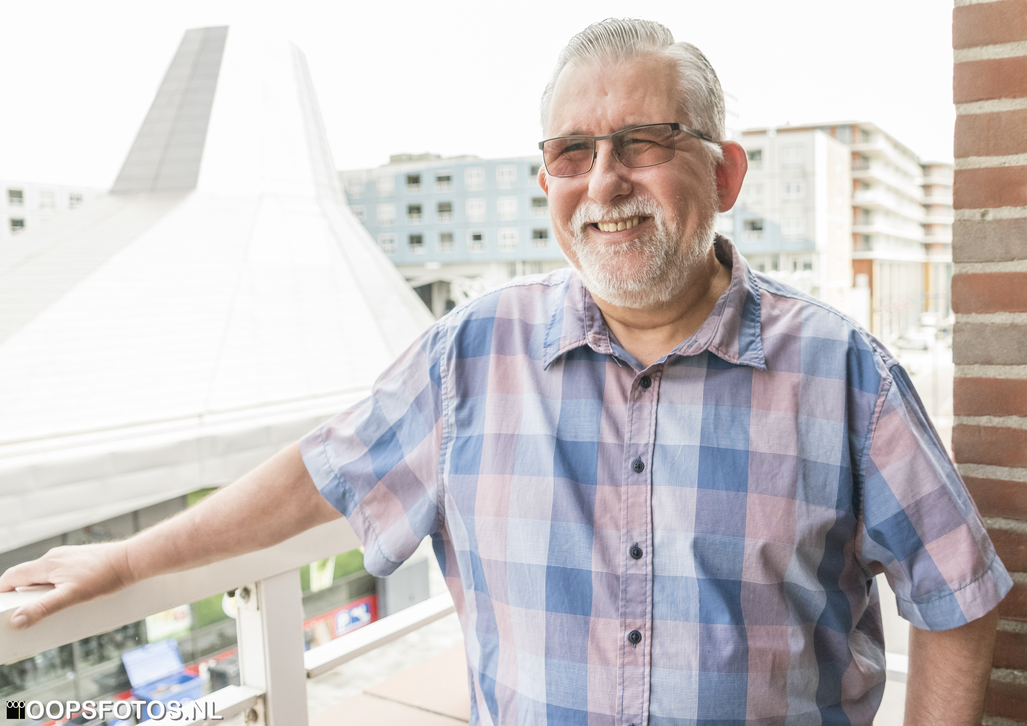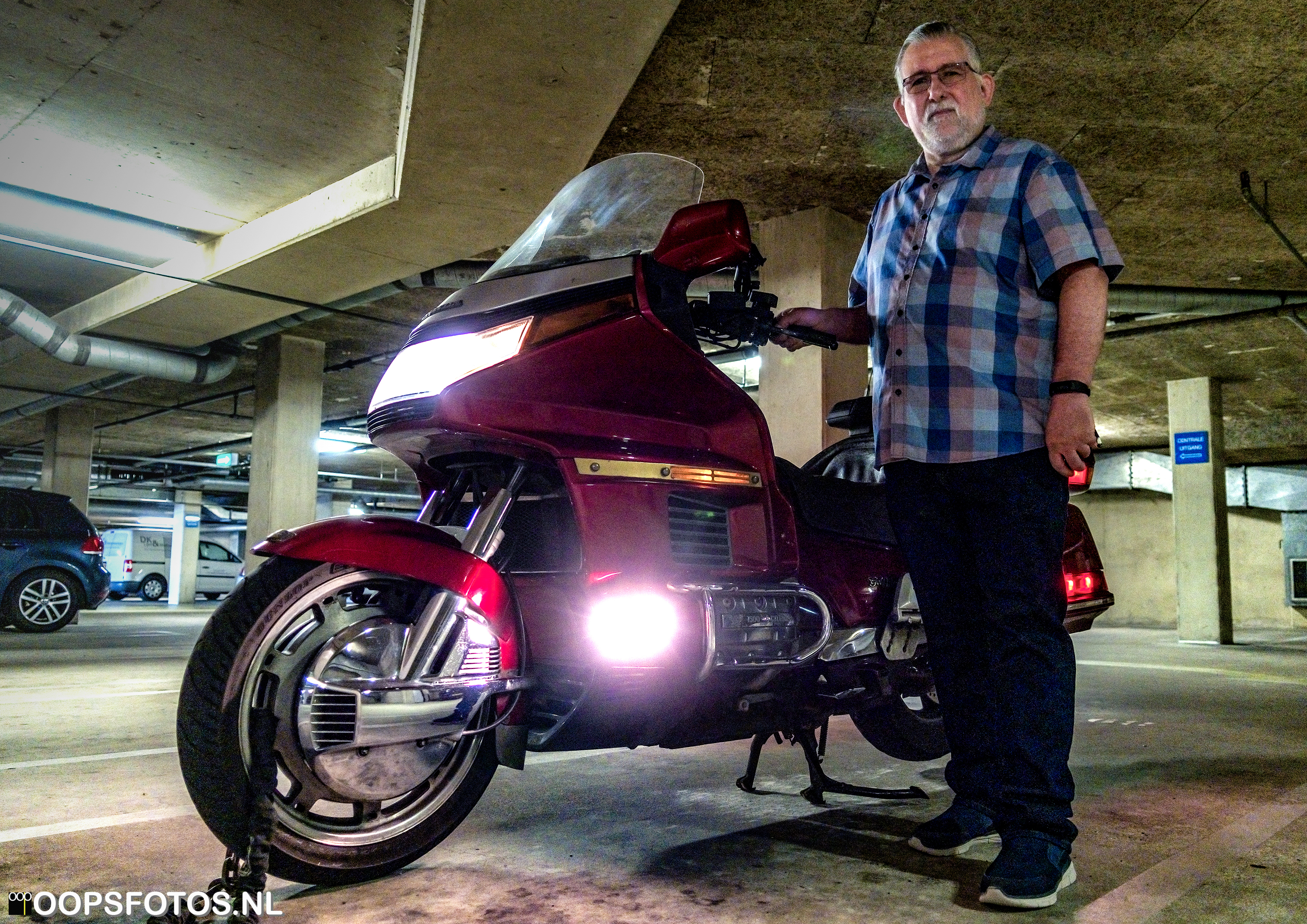 ‘Hans en ik besluiten de foto’s te gaan maken op het balkon van zijn appartement. Het balkon kijkt uit op de Markt en op het karakteristieke gebouw van La Place. Hans vertelt honderduit. Over zichzelf. Over zijn hobby’s. Over zijn vrijwilligerswerk. Over zijn werk in de grafische industrie (mooie nostalgie!). Over zijn Goldwing. Wanneer we klaar zijn met de portretten vraagt Hans of ik zijn motor, de Honda Goldwing, nog wil zien… Overbodige vraag. En dan staan we bij dat schitterende mechaniek. De machine heeft precies die rode kleur die hij moet hebben. Wát een juweel. Daarom ook nog maar een foto gemaakt van een trotse Hans naast zijn prachtige vervoermiddel.’