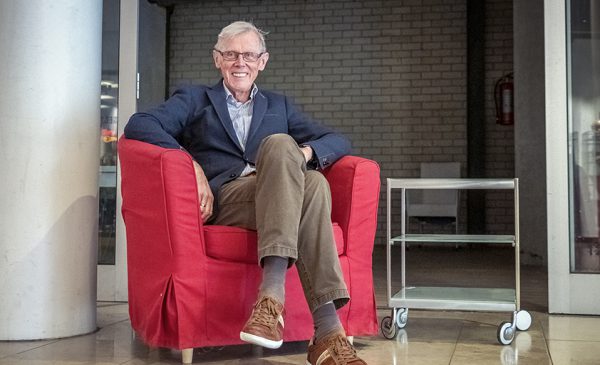 ‘Wel staan er een tafel en wat stoelen op de kale betonvloer. Dus plaatst Henk zich in een rood fauteuiltje met een bijzettafeltje voor de deuropening van wat dadelijk het VrijwilligersHuis zal zijn. Henk zit. Henk vertelt. Ik maak foto’s. En wanneer we klaar zijn, blijkt dat Peter (een van de mensen die Henk bijstaan in de realisatie van het VrijwilligersHuis) nog doende is om een banner te laten bezorgen. Wanneer die arriveert, neemt Henk opnieuw plaats in de fauteuil en maken we de portretserie af.’