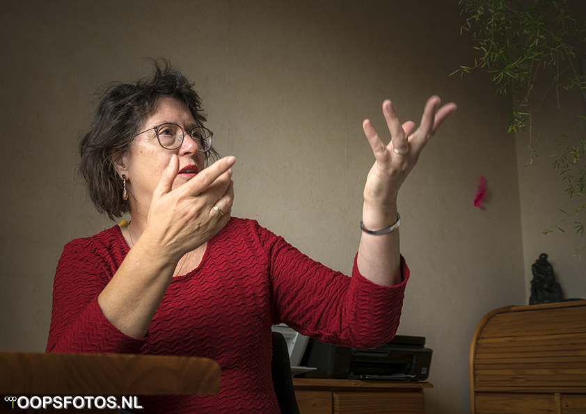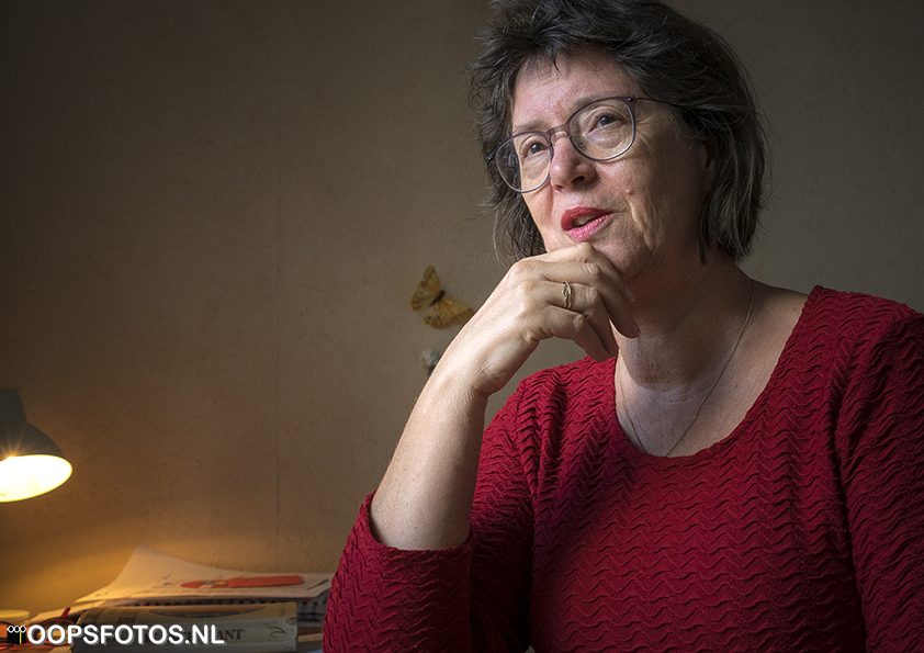 Arend Bloemink: ‘Wanneer de voordeur op mijn aanbellen geopend wordt, staat daar het Portret van deze Week. Enigszins afstandelijk kijkt ze me onderzoekend aan. Alsof ze me probeert te ‘lezen’. Als dan de voordeur achter me in het slot valt, vraagt ze me of we misschien eerst even naar de woonkamer gaan… De manier van vragen laat me weten dat zij voor wat de fotolocatie betreft een ánder idee heeft. En dat is uitstekend, ik fotografeer iemand het liefst dáár waar hij of zij zich het lekkerst voelt. In dit geval, zo geeft Hannie aan, is dat haar werkkamer. Dús, op naar de eerste verdieping.’