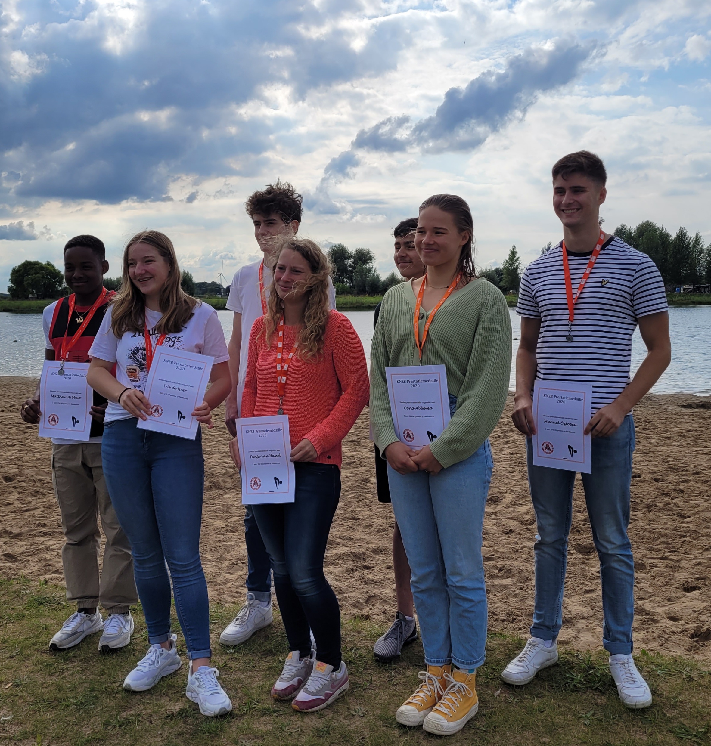Matthew Hibbert (zilver), Iris de Heer (brons, Daan Willemen (brons), Tanja van Hassel (zilver), Kayra Asci (zilver), Oona Abbema (goud) en Manuel Öztopcu (zilver) staan trost op de foto hieronder. Daphne Wils behaalde ook een gouden prestatiemedaille. Zij ontbreekt op de foto. Ze is inmiddels in Amerika gestart met het tweede jaar College, waar ze studie en schoonspringen combineert.