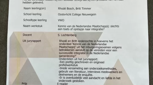 Voor hun profielwerkstuk deden Rhodé en Britt een half jaar lang onderzoek naar welke kennis van de Nederlandse samenleving volgens verschillende groepen belangrijk is voor een goede inburgering. Op basis van hun bevindingen formuleerden zij hier ook verbeterpunten voor. In haar rapport roemt de jury de leerlingen om de originaliteit van het onderwerp en de nieuwsgierige onderzoekshouding, ‘een eigenschap die een socioloog altijd zou moeten hebben,’ aldus het juryrapport.