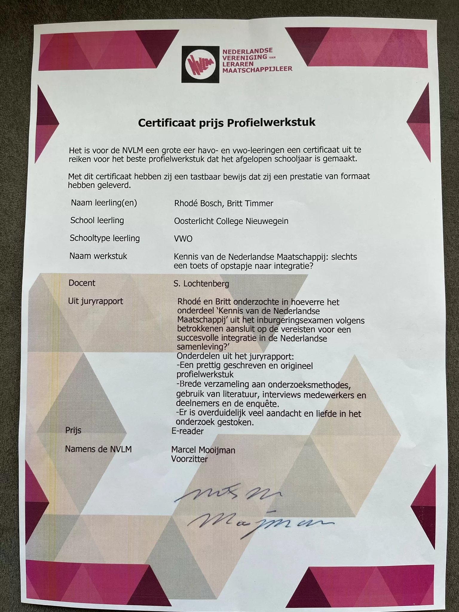 De Nederlandse Vereniging van Leraren Maatschappijleer (NVLM) looft elk jaar een prijs uit voor het beste profielwerkstuk dat betrekking heeft op de vakken maatschappijleer en maatschappijwetenschappen. De prijs werd uitgereikt door hoogleraar constitutioneel recht Ingrid Leijten, op de jaarlijkse maatschappijleer docentendag in Den Haag.