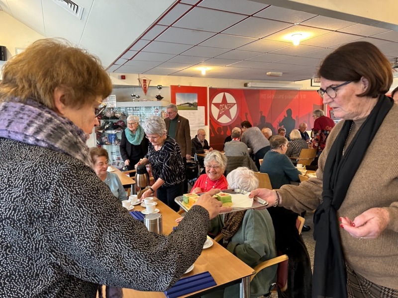 Vrijwilligers verzorgen de koffie en de lunch. Ook cliënten van ‘Reinaerde’ waren druk als gastvrouw/gastheer, vanuit dagbesteding. Na de lunch werd Hanny Plomp nog even meegenomen naar de bouwplaats van de nieuwe voetbalaccommodatie samen met Betsy de Keizer (o.a. ambassadeur voor Domotica) die ook te gast was.