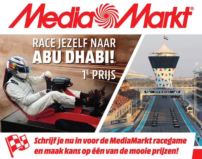Wil jij aanwezig zijn bij de afsluiter van het Grand Prix-seizoen, de race in Abu Dhabi? Schrijf je dan nu in voor de Racegame in MediaMarkt Nieuwegein. In samenwerking met Ziggo eBattle F1 maakt iedere deelnemer kans op die te gekke hoofdprijs: een compleet verzorgd Grand Prix arrangement naar de naar Abu Dhabi voor 2 personen!