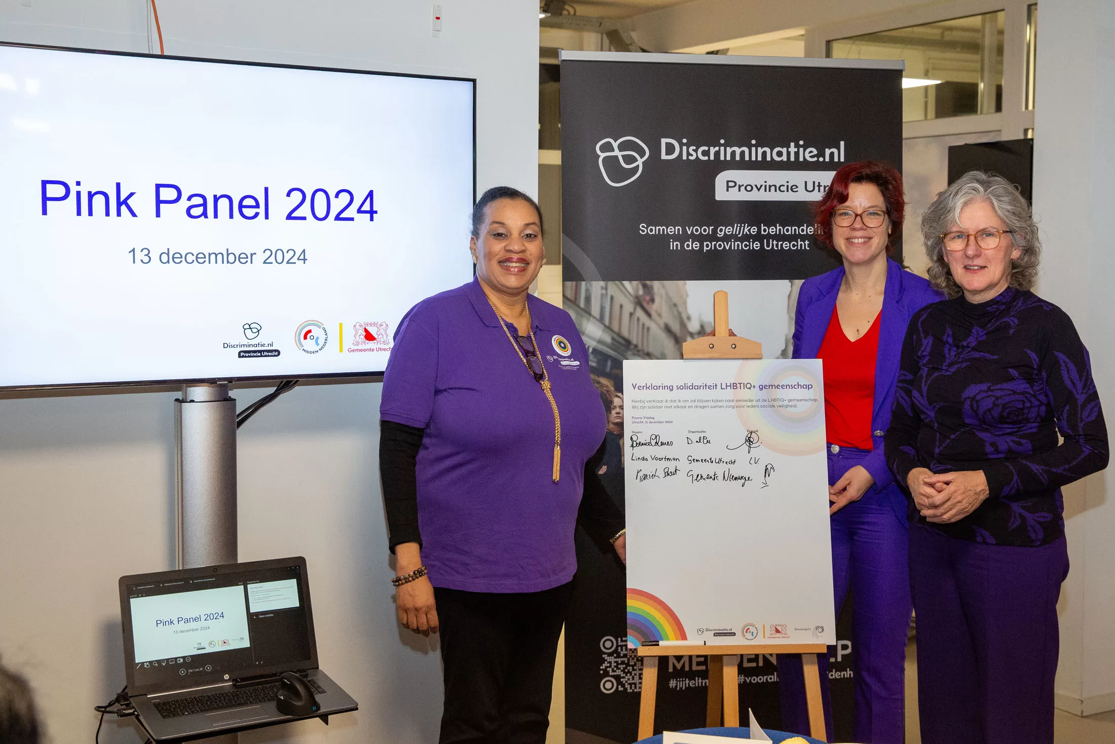 Op de foto v.l.n.r.: Bernice Calmes, directeur Art1MN Discriminatie.nl Provincie Utrecht, Wethouder Linda Voortman (Gemeente Utrecht) en Wethouder Marieke Schouten (Gemeente Nieuwegein)